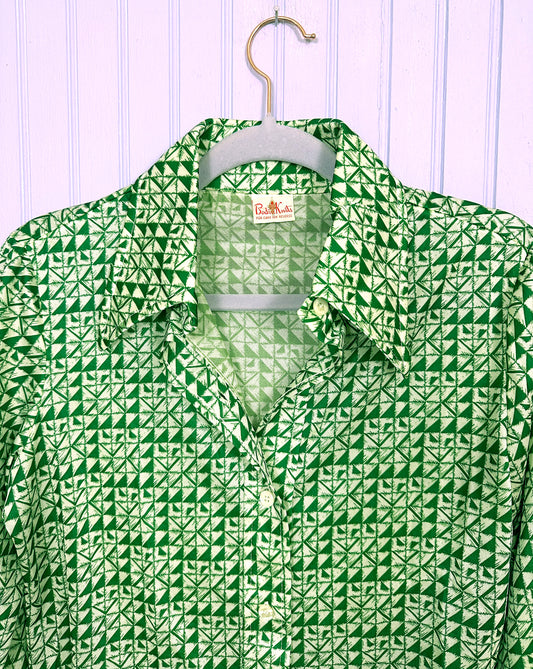 1970's Disco Buttondown Green Geometric Print